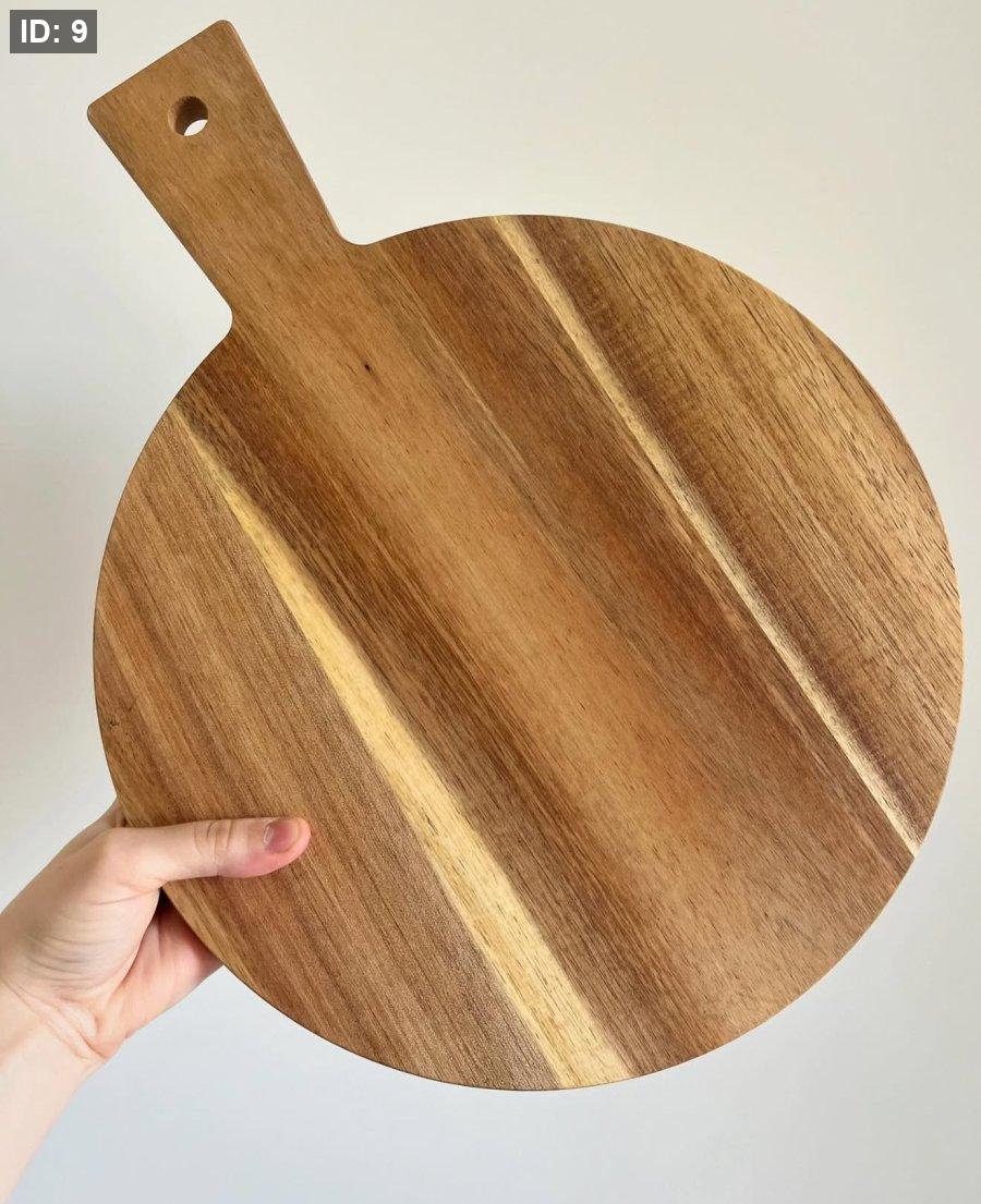 لوح تقديم مصنوع من خشب طبيعي عالي الجودة بتصميم دائري أنيق مع مقبض عملي لسهولة الحمل والتعليق. مثالي لتقديم الجبن، المعجنات، الفواكه والمقبلات